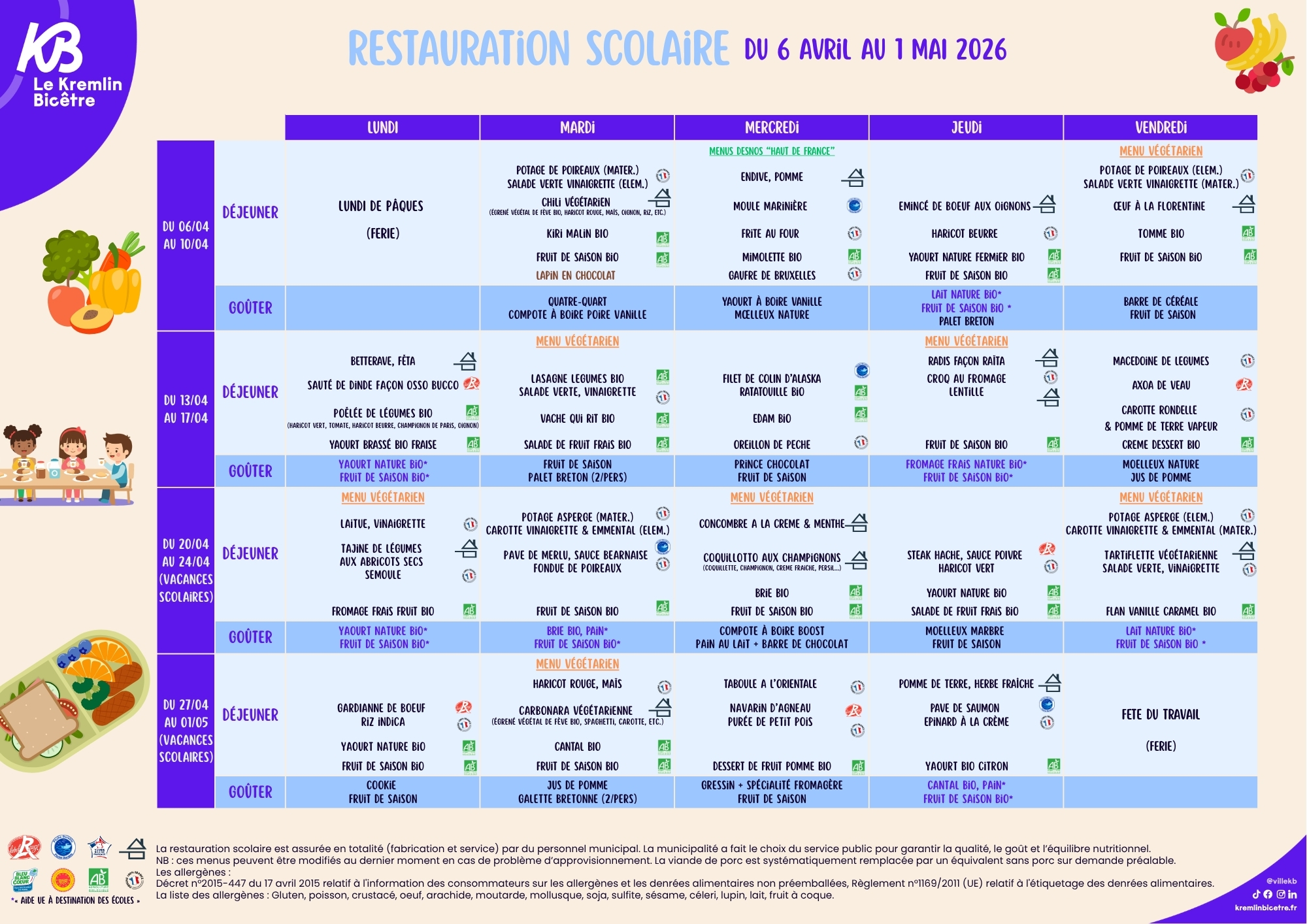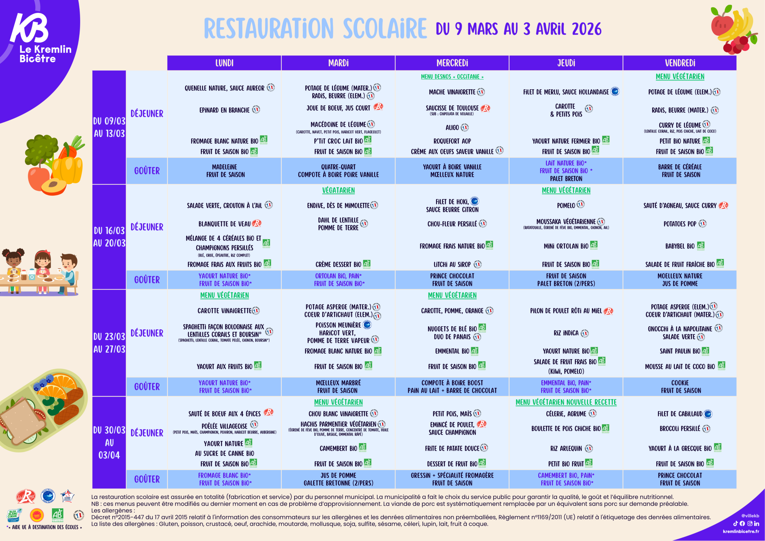 Retrouvez les menus dans les cantines scolaires de la ville.