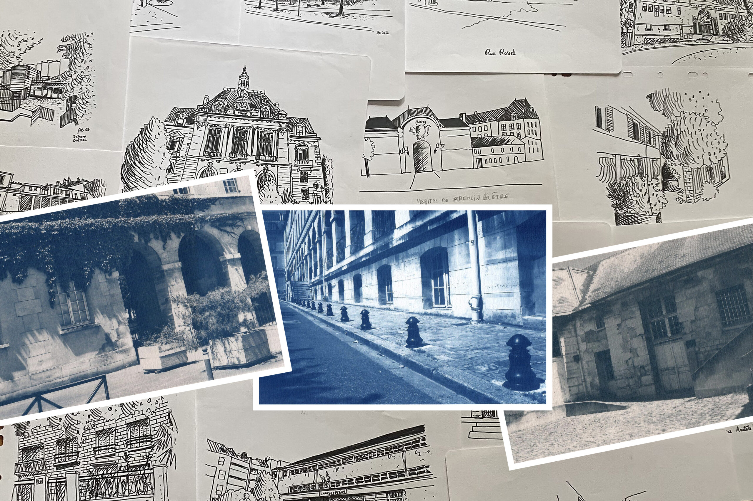L’exposition Regards Croisés présente les dessins au feutre noir d’Anne Batista et les cyanotypes de Veronica Santamaria Palombo, explorant l’architecture du Kremlin-Bicêtre. Chaque photo poétique de l’hôpital est associée à un dessin de bâtiment emblématique, disparu ou encore présent. Cette rencontre artistique invite à réfléchir sur la mémoire urbaine et les transformations de la ville au fil du temps.