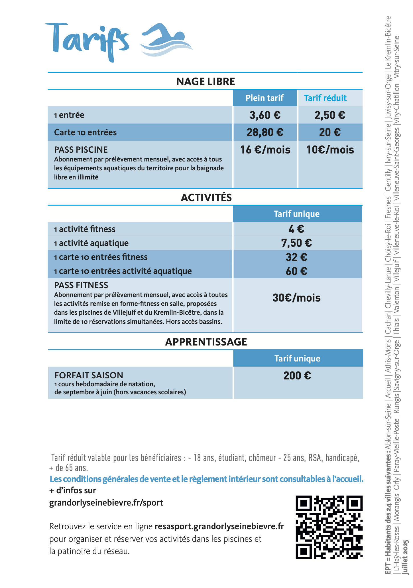 Les cartes 10 entrées, trimestrielles, annuelles et illimitées sont également valables dans les autres piscines de l’ex Communauté d’agglomération : Villejuif, Fresnes, Cachan et L’Haÿ-les-Roses.
