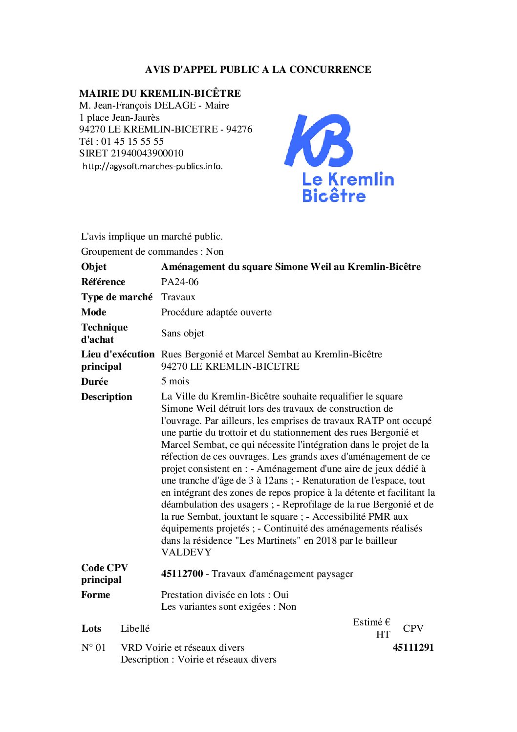 Objet : Aménagement du square Simone Weil au Kremlin-Bicêtre