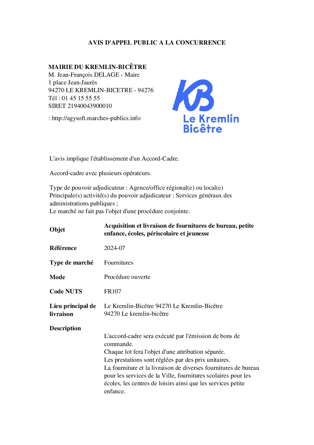 Objet : acquisition et livraison de fournitures de bureau, petite enfance, écoles, périscolaire et jeunesse