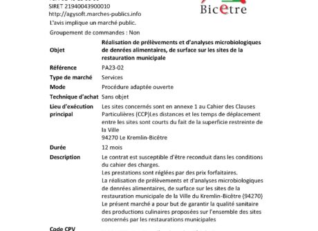 Objet : Réalisation de prélèvements et d’analyses microbiologiques de denrées alimentaires, de surface sur les sites de la restauration municipale.