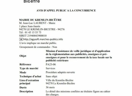 Objet : Mission d’assistance de veille juridique et d’application de la réglementation aux publicités, enseignes et préenseignes et pour le recouvrement de la taxe locale sur la publicité extérieure