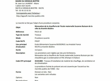 Objet : Rénovation de la chaufferie de l’école maternelle Suzanne Buisson de la ville du Kremlin-Bicêtre