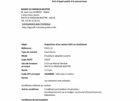 Objet du marché : Acquisition d’un camion GNV ou bioéthanol.