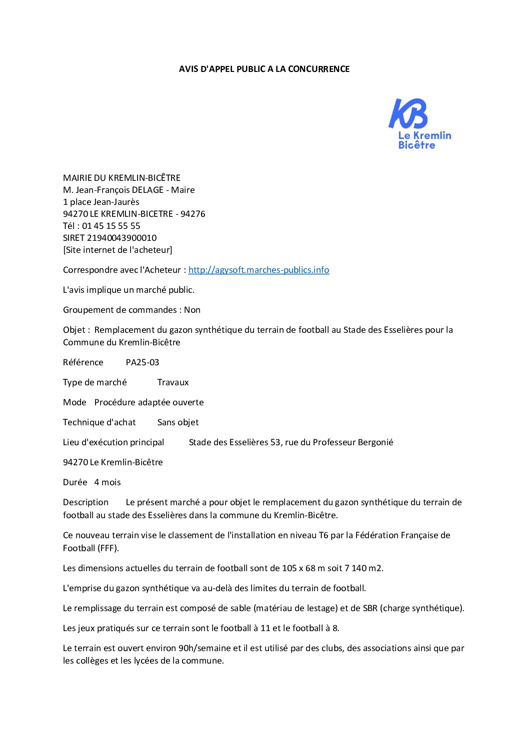 Objet : Remplacement du gazon synthétique du terrain de football au Stade des Esselières pour la commune du Kremlin-Bicêtre