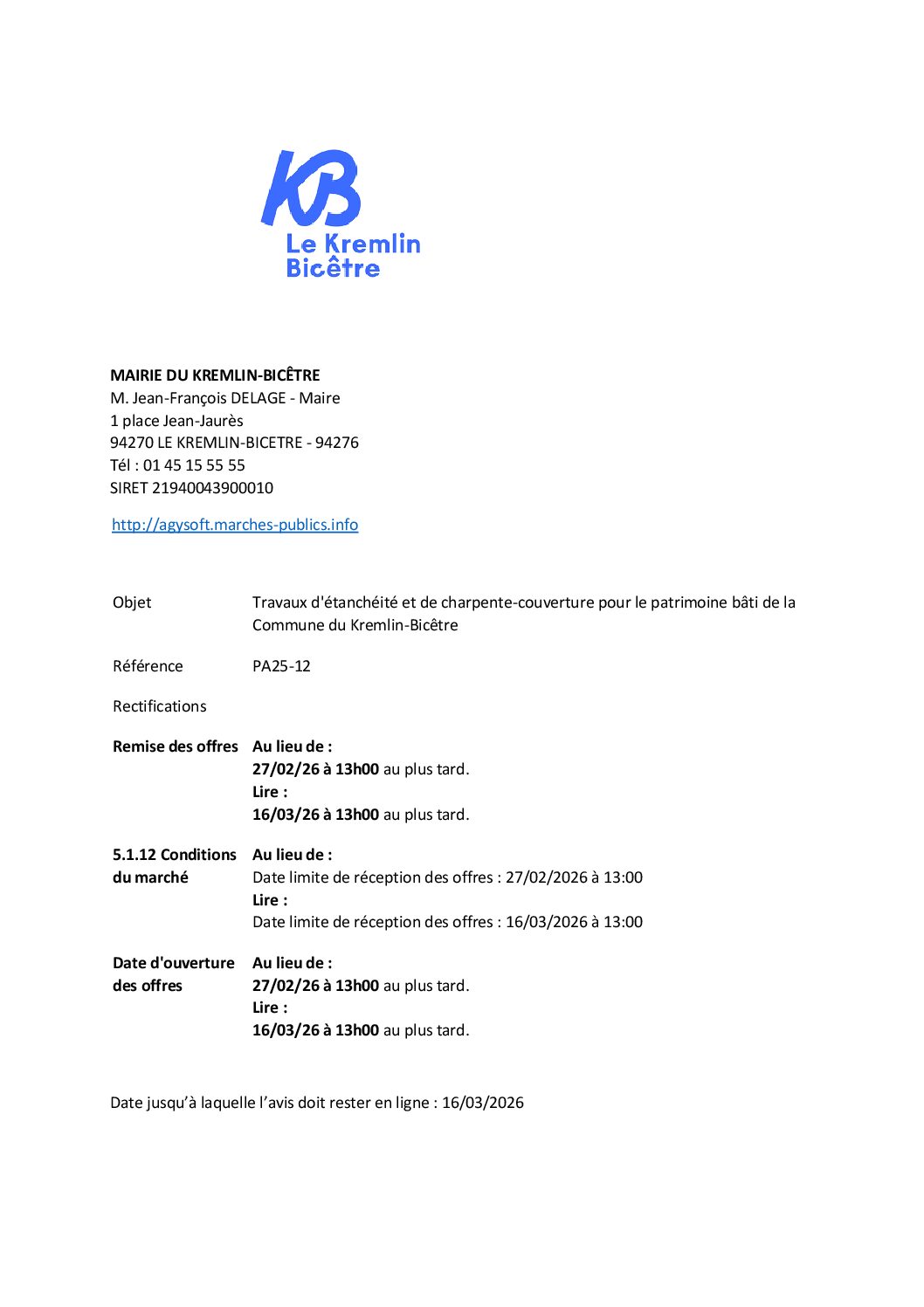 Objet : Travaux d’étanchéité et de charpente-couverture pour le patrimoine bâti de la Commune du Kremlin-Bicêtre