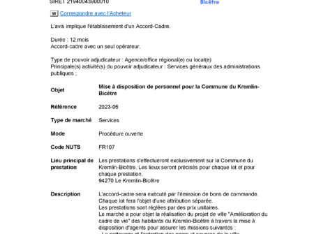 Objet du marché : Mise à disposition de personnel pour la Commune du Kremlin-Bicêtre