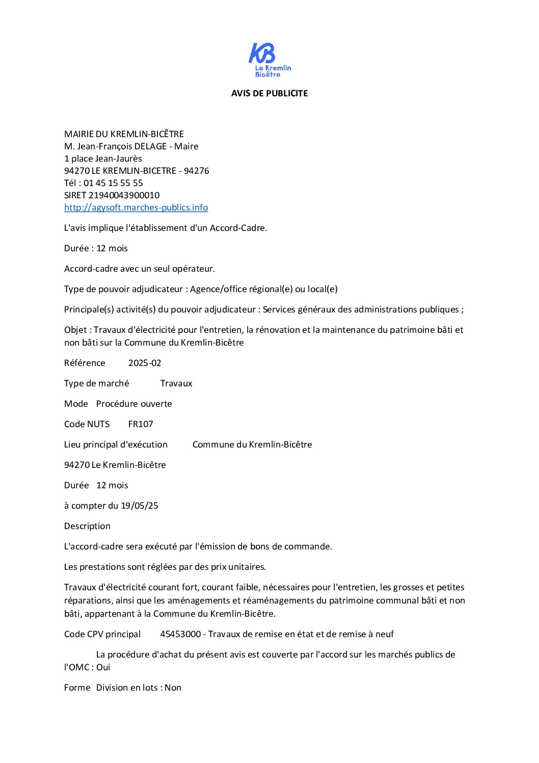 Objet : Travaux d’électricité pour l’entretien, la rénovation et la maintenance du patrimoine bâti et non bâti sur la Commune du Kremlin-Bicêtre
