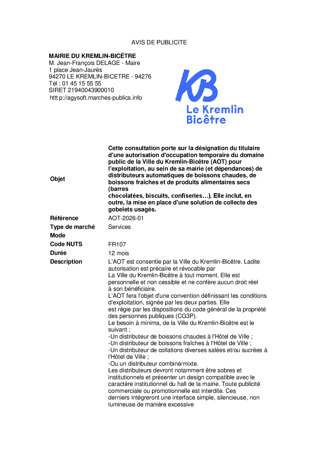 Objet : Cette consultation porte sur la désignation du titulaire d’une autorisation d’occupation temporaire du domaine public de la Ville du Kremlin-Bicêtre (AOT) pour l’exploitation, au sein de sa mairie (et dépendances) de distributeurs automatiques de boissons chaudes, de boissons fraîches et de produits alimentaires secs (barres chocolatées, biscuits, confiseries…). Elle inclut, en outre, la mise en place d’une solution de collecte des gobelets usagés.