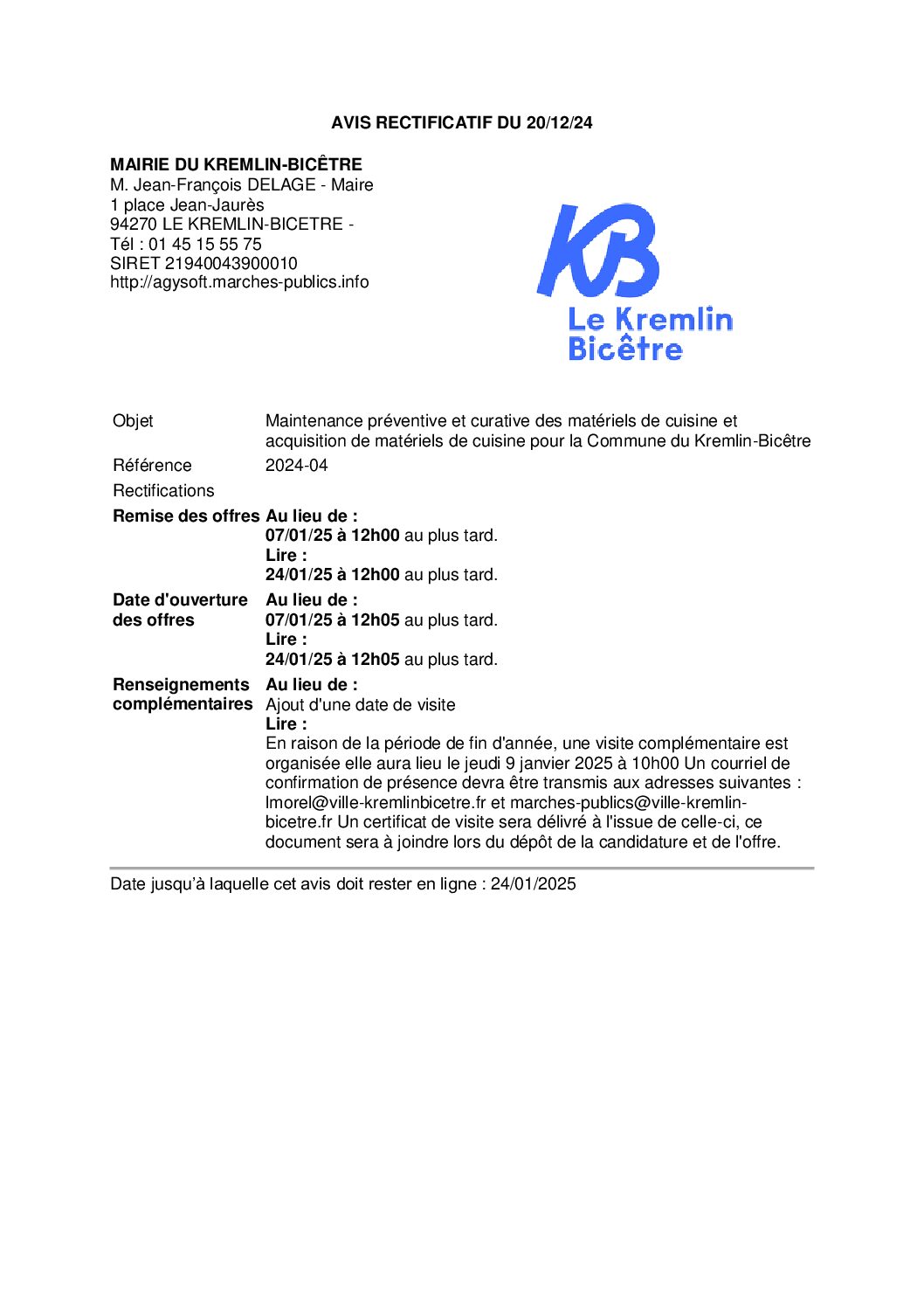 Objet : Maintenance préventive et curative des matériels de cuisine et acquisition de matériels de cuisine pour la Commune du Kremlin-Bicêtre.